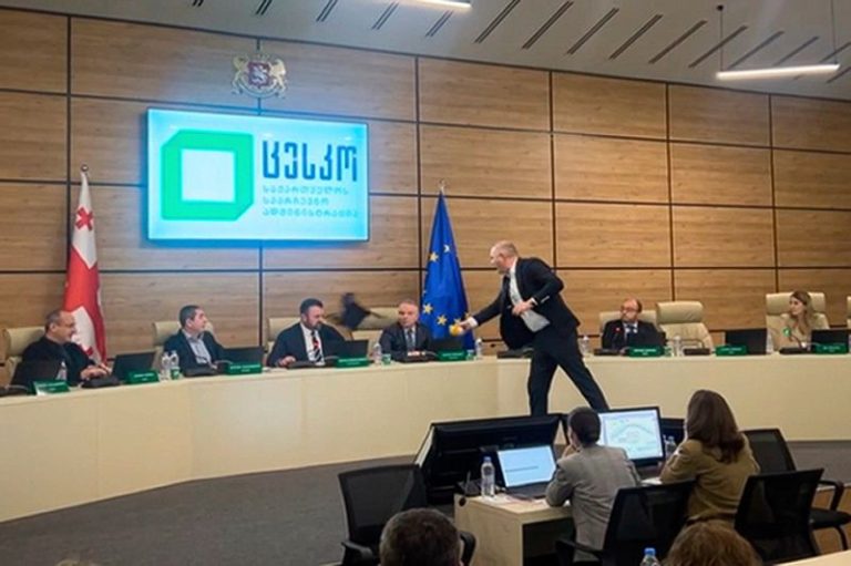 The Saturday session was interrupted when David Kirtadze, a commission member from the opposition United National Movement party, threw black paint at commission chairman Giorgi Kalandarishvili.